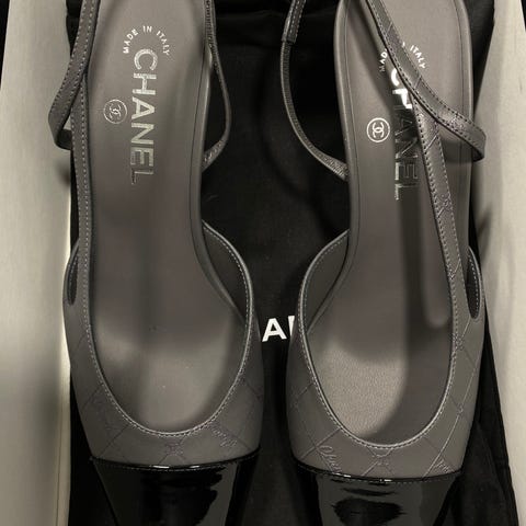Chanel mules skor i storlek 38. Modellen är öppen bak med låg klack. Skorna är tillverkade i skinn med vit ovandel och mörk tå i kontrastfärg. Ovandelen har kedjedetalj och rem över foten. Slät yttersula. Levereras med originalkartong och dustbag enligt bild. Passar som vardags- eller festskor för dam.