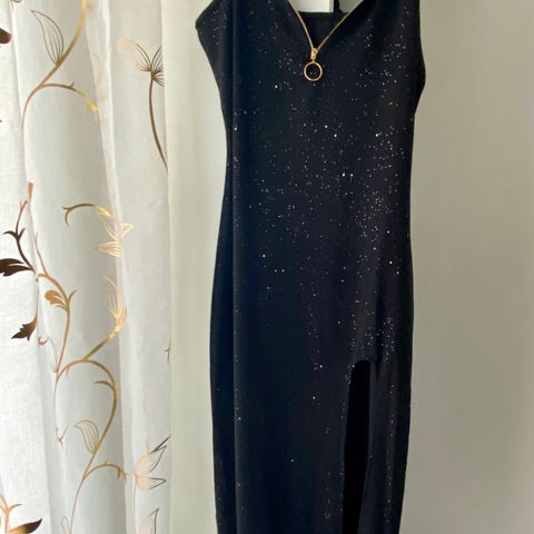 Elegant svart klänning med v-ringning och dekorativa guldfärgade spännen med strassdetaljer på axelbanden. Klänningen har en figurnära passform med veckade detaljer i midjan och en slits baktill för ökad rörlighet. Dragkedja i ryggen. Klippt bort etiketten uppskattas till st. Xs-s. Mått längd 135 , bredd under brösten 37 -38