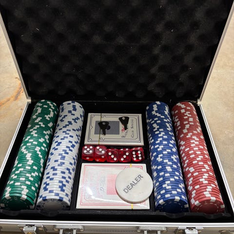Poker set i aluminiumväska med marker, spelkort, dealer-knapp och tärningar. Väskan är i metall/aluminium med handtag och lås. Markerna är i flera färger, anpassade för pokerspel. Setet är avsett för kortspel som poker och andra liknande spel i hemmet eller på fritiden.