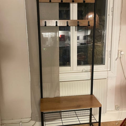 Säljer ett smalt och stilrent konsolbord från SoBuy. Passar bra i hall, bakom soffa eller under ett fönster. Svart metallstomme och skivan är tillverkat av spån- och träfiberskiva med ett tryck av trä.