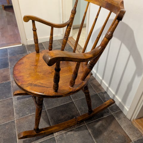 Gungstol i trä med svarvade ben och armstöd. Trasig i tyget vid två ställen.