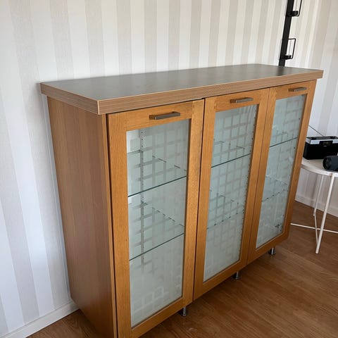 Vit vitrinskåp/skänk med fina glasdörrar.Bakom glasdörrarna finns hyllplan i glas som kan användas för förvaring eller exponering av glas, flaskor eller dekorationer. Möbeln har runda metallknoppar på lådorna och dörrarna. Passar som förvaring i vardagsrum, matsal eller hall och kan även användas som tv-bänk beroende på mått och behov.