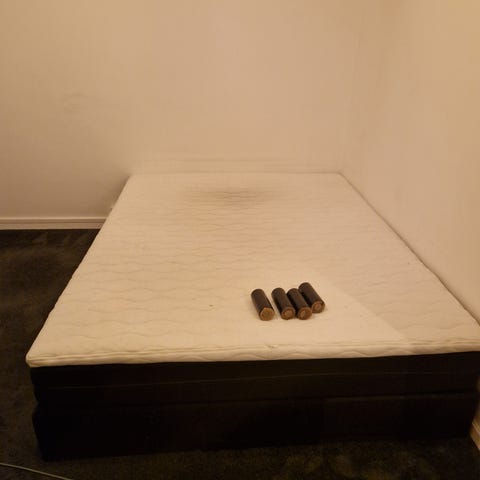 IKEA säng med madrass i neutral design. Sängen har en grå sängram med vadderad huvudgavel och en ljus madrass ovanpå. Passar som dubbelsäng i sovrum eller gästrum. En enkel och rak modell som fungerar i de flesta inredningsstilar. 160cm bred.
