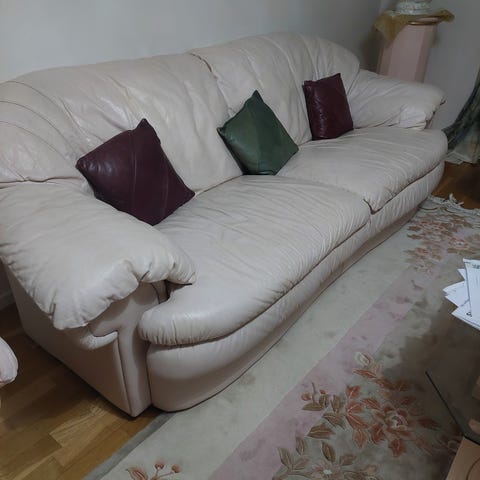 Två delar: tresits och tvåsits. Dynorna är i bra skick, bara skinet är lite repig där och där som ni ser på sista bilden. Sofforna är isärplockade-kan hämtas även med ett mindre släp. Finns i Pukavik/Sölvesborgs kommun.