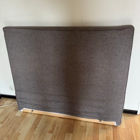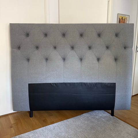 IKEA sänggavel i grå textil i nyskick, passar till 120 cm bred säng.