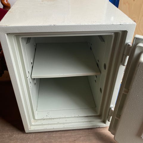 Inkless myntkassett i metall, utformad som en kontantkassa för sortering och förvaring av mynt. Insatsen har fack märkta för olika myntvalörer och underlättar uppräkning och organisering av kontanter. Ytterlådan är beige med bärhandtag upptill och framtill samt lås på framsidan. Lämplig för användning i butik, på loppis eller vid annan kontanthantering där tydlig sortering av mynt behövs.
