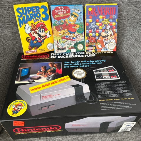 Säljer ett Super Nintendo med originalkartong, 2 handkontroller, nätadapter och strömadapter.