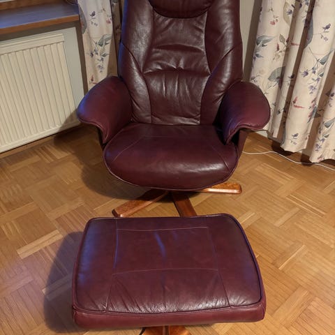 2 st Fåtöljer med tillhörande fotpall i vinrött läder. Fåtöljen har hög rygg med nackstöd, breda armstöd och snurrunderrede med fyra ben. Fotpallen är fristående och har stoppad sits i samma läderklädsel som fåtöljen. Passar som läs- eller vilfåtölj i vardagsrum eller arbetsrum.