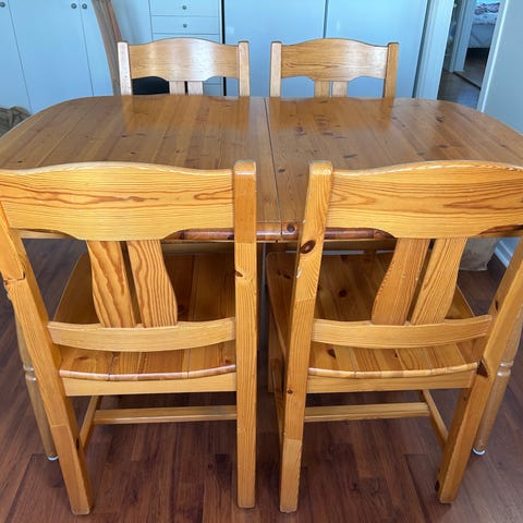 Matbord med 4st stolar . Väldigt fint trä material , längd är 118cm , bred är 74 och höjd är 74 cm