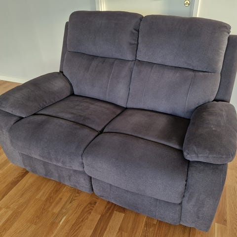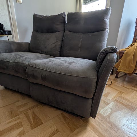 Elektrisk recliner. Där knapparna sitter finns även USB-uttag. På tre-sitsen är de två yttersta platserna med recliner. Mellangrå färg.