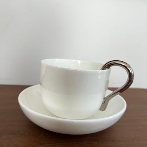 2 vita koppar med fat ur serien Spin från Design House Stockholm, formgivna av Marie-Louise Hellgren