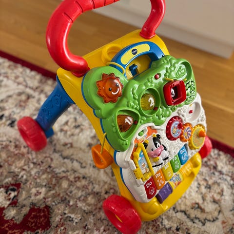 Fisher-Price Little People gåbil med aktivitetsleksaker i flerfärgad plast. Leksaken har sits att sitta på, handtag baktill för att hålla i samt fyra hjul. På framsidan finns inbyggt minipiano med färgade tangenter och trumma upptill. Sidorna har illustrerade motiv. Passar för små barn som vill åka, skjuta framför sig och utforska olika ljud- och aktivitetsfunktioner inomhus.