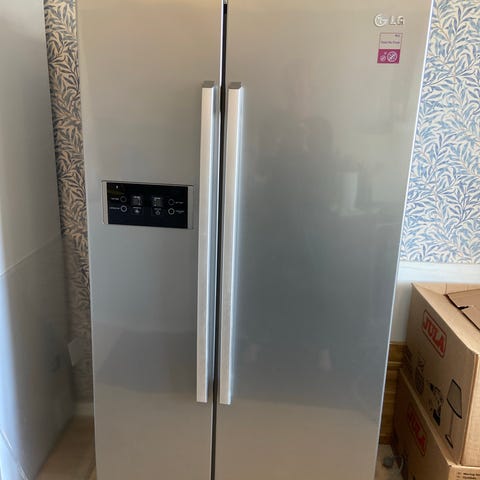 Säljer två gråa skåp som ligger ovanför kyl och frys.