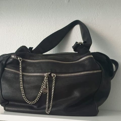 Svart väska med dragkedja och ett foder i en grön nyans. Två avtagbara remmar. En kortare kedja och en längre bred justerbar rem. Väskan har en etikett med texten ”BIMBA Y LOLA”.