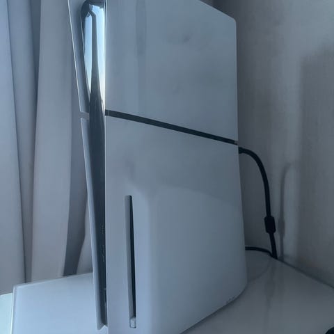 Sony PlayStation 5 spelkonsol med två DualSense-handkontroller. Konsolen är vit och står vertikalt på bild. Medföljer en vit och en svart DualSense-handkontroll. Passar för spel, film och underhållning i hemmet och kan användas av både enskilda spelare och flera spelare samtidigt.