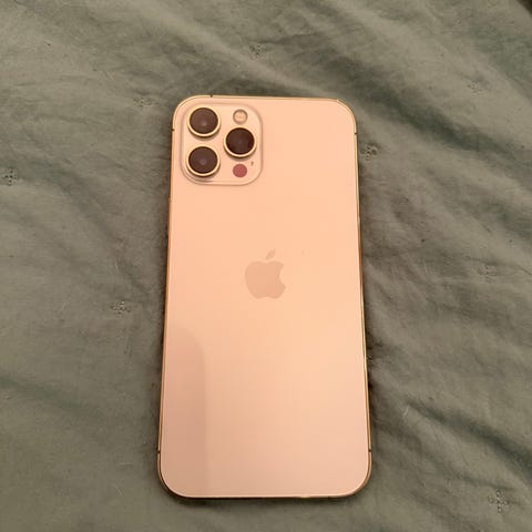 Apple iPhone 12 Pro mobiltelefon med 128 GB intern lagring. Färg: guld. Både fram- och baksida visar sprickor och slitage enligt bilderna.