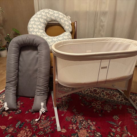Amningskudde, spjälsäng, badbalja, potta, babygym, skötväska, babynest, bilstol för bebis och dubbla uppsättningar lakan. Fina märken: Babybjörn, Britax Römer, Bremo.