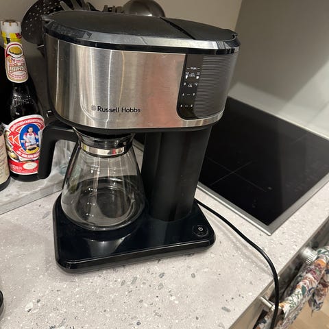 Russell Hobbs kaffebryggare i svart plast med detaljer i rostfritt stål. Bryggaren har en glaskanna med handtag och droppstopp. På sidan finns vattennivåindikator och på framsidan en strömbrytare med kontrollampa. Elsladd med jordad kontakt. Passar för bryggning av filterkaffe i hushållsmiljö.