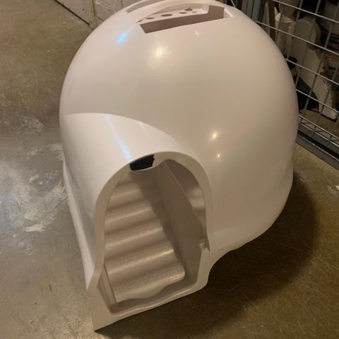Kattlåda i vit plast. Ovansidan har ett lock med rund öppning som gör att kattsand skakas av tassarna när katten hoppar ut. Medföljande halkmatta i mörkgrå färg placeras framför lådan för att fånga upp sand.