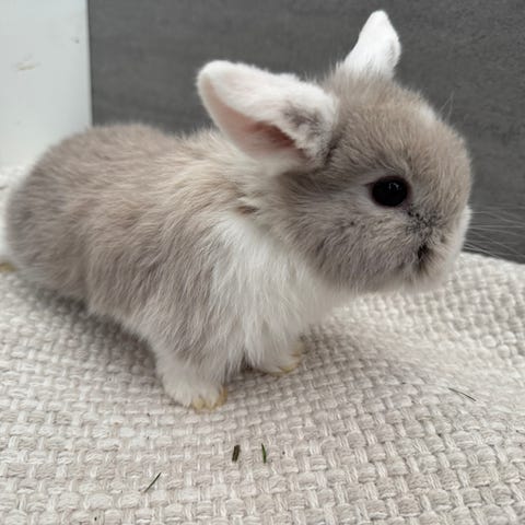 Fin liten tjej, renrasig dvärgvädur, kommer från trevliga och sociala föräldrar. Hanterad dagligen sedan hon kommit ut ur boet. Van vid barn och andra kaniner.