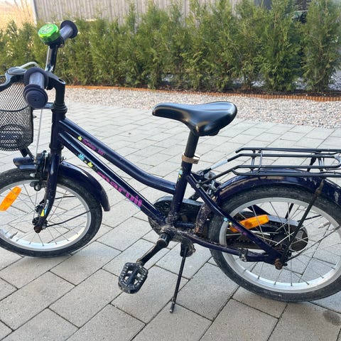 16" barncykel från Biltema. Svart grundfärg med härligt rosa applicerad metalliclack. Bra bruksskick med fotbroms, handbroms, stänkskärmar i metall, kulor på ekrarna samt pakethållare. Fungerar väl, återfinns en liten reva på sadeln. Passar barn 3-6 år gamla.