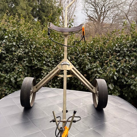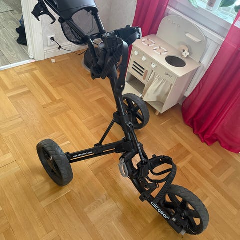 Golfvagn med tre hjul i svart färg. Vagnen har handtag med integrerad förvaringslåda och hållare för scorekort eller liknande. Konstruktionen är hopfällbar för enklare transport och förvaring. Stora hjul ger stabilitet och gör den lämplig för användning på golfbanor med olika underlag. Passar för standard golfbag som fästs framtill och baktill med remmar.