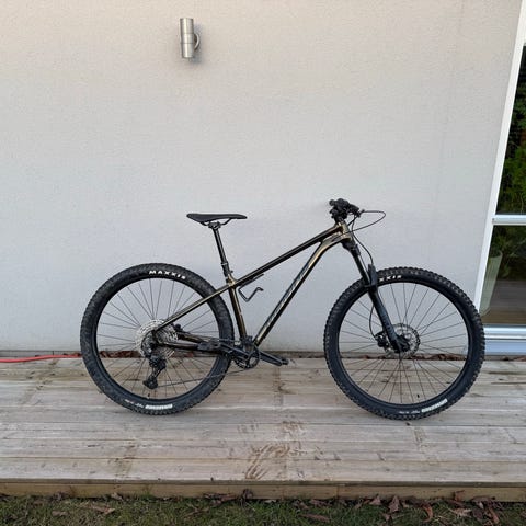 Cykeln är i gott skick. Den har använts för skogscykling och har därför vissa repor, men inget som påverkar funktion eller prestanda. Den är fullt fungerande, stabil och rullar som den ska.