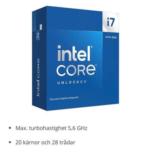 Intel Core i7-14700K processor för stationär dator med sockel LGA1700. Tillhör Intels 14:e generation Core-processorer och är upplåst (Unlocked) för möjlig överklockning. Passar moderkort med LGA1700-sockel och stöd för denna generation av Intel Core i7. Lämplig för användning i stationära datorer för exempelvis kontorsarbete, spel eller mer krävande applikationer beroende på övrig systemkonfiguration.