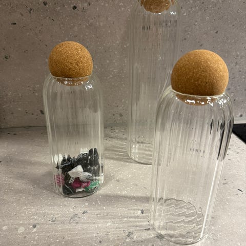 4st glasburkar med trälock. Socker, mjöl, gryn & salt.
