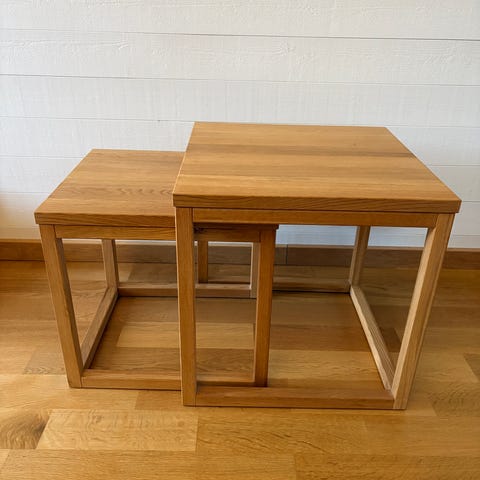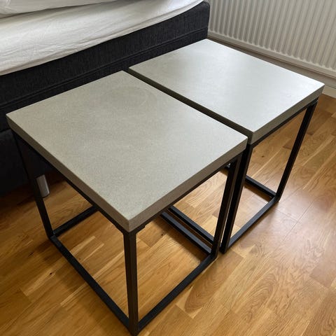 Satsbord HAVSTA i grått, set om 2. Stabil konstruktion i massivt trä och tidlös design. I fint skick med normalt bruksslitage. Perfekt som soffbord, sidobord eller förvaring. Utgått från IKEA och svåra att få tag på.