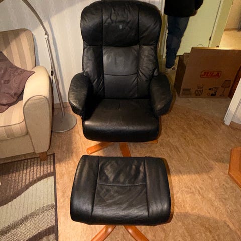 Fåtölje och fot pall, läder svart, fint och välvårdad Vridbar/rygg justering när man sitter och trycker mot ryggen väldigt bekvämt, pris 900 kr bara seriösa köpare tack