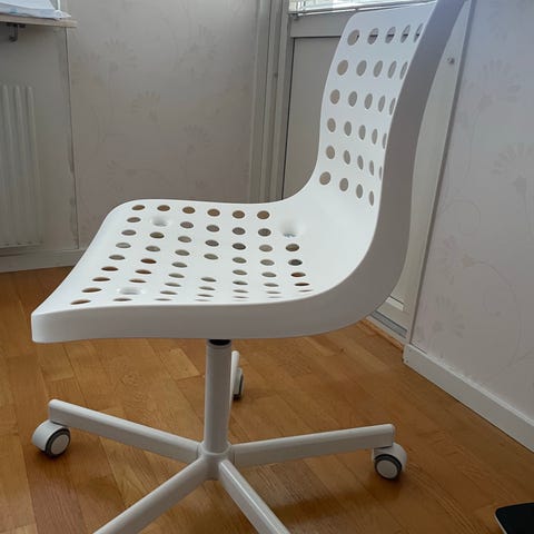 IKEA skrivbordsstol i vit formpressad fanér med hålmönstrad rygg. Stolen har sits och rygg i ett stycke och är monterad på ett femarmat underrede i metallfärg med hjul. Höjden kan justeras med spak under sitsen (40-53 cm) . Passar som kontorsstol eller stol till skrivbord i hemmet, exempelvis i arbetsrum eller tonårsrum.
