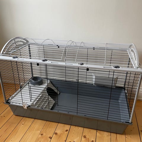 Ferplast bur med glasunderdel för smådjur. Överdelen består av en svart metallbur med täta galler och frontlucka. Underdelen är ett rektangulärt akvarium/terrarium i glas med grå ram. Till buren finns olika tillbehör som 2 olika löphjul, matskålar, multivitamin, vattenflaska, hängbro, godisdroppar, träleksaker och strö, anpassade för mindre gnagare eller liknande smådjur.