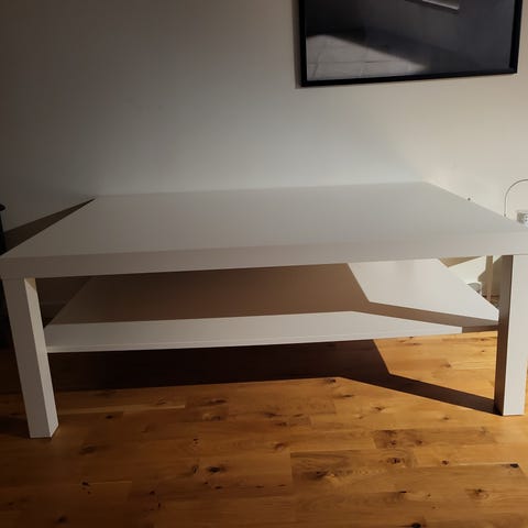 Vitt soffbord med glasskiva och en utdragbar låda från Mio. 60x120x36 cm. En repa på ena nedre sidan samt kantstött enligt bilder.