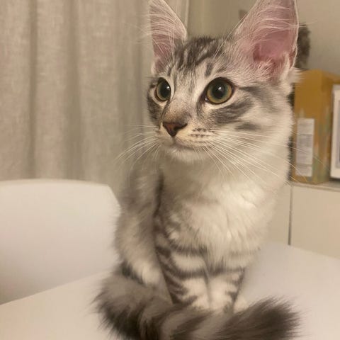 Bella är en underbar liten hona på 3,5 månader. Hon är en fin mix av Maine Coon och Sibirisk katt, med mjuk halvlång päls och stora uttrycksfulla ögon.