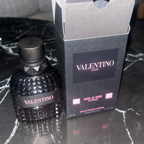 Valentino Uomo Born In Roma Intense parfym eau de parfum. Doften levereras i originalflaska med nitar och tillhörande ytterkartong enligt bilderna. Parfymen är en eau de parfum-intensitet avsedd för herr. Flaskan är tillverkad i mönstrat glas med mörkare toning nedtill och svart kork.