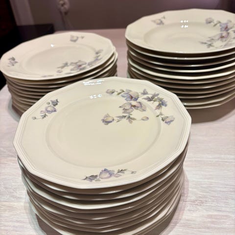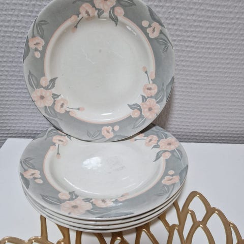 Ett set med tallrikar från COLOROLL. Tallrikarna har ett blommönster i rosa och grått.