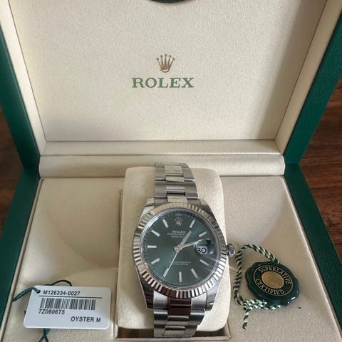 Fullset Rolex Datejust 36mm 126234 från 2021 med den svarta, klassiska urtavlan. Sitter på oysterlänk och med krans i vitguld.