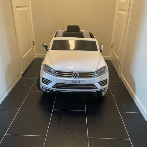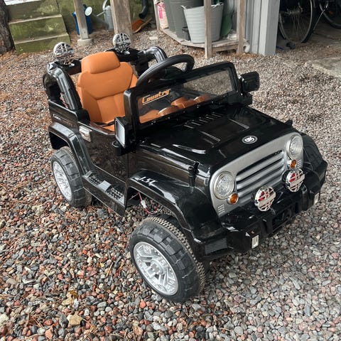 Fin barnbil med fjärrkontroll och laddare. Högtalare och musik i bilen, lampor, tuta, , kan styras både av barnen själva eller någon vid fjärrkontrollen.