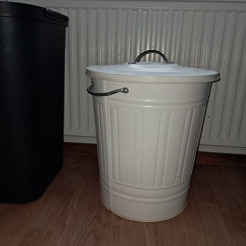 Soptunna/pedalhink i metall med måtten 28x28x50 cm. Tillverkad i tennfärgad metall (märkt "TIN"). Rektangulär form med lock och pedal längst ned på framsidan för öppning. Textdekor på framsidan. Kan användas som avfallshink eller för förvaring i exempelvis kök, tvättstuga eller förråd.