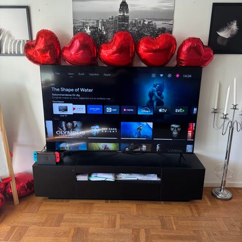 Philips tv med platt skärm. Väggmonterad i bilderna och visas användas med bakgrundsbelysning bakom skärmen (ambilight). Lämplig för tv-tittande, spel.