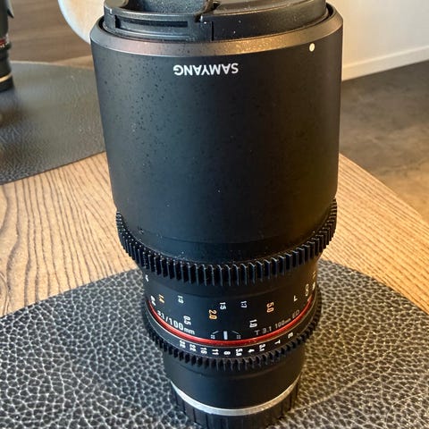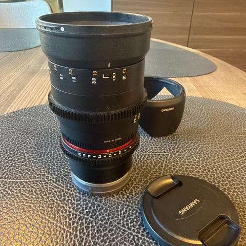 Samyang 50mm T1.5 cineobjektiv i svart. Till Sony full frame. Manuell fokus med tydliga avståndsmarkeringar och T-bländare markerad från T1.5. Utrustat med kuggringar för användning med follow focus-system samt avtagbart motljusskydd. Passar för videoproduktion och filmning där manuell kontroll över fokus och bländare önskas. Fattningstyp framgår inte av uppgifterna och behöver kontrolleras mot kamera innan användning.