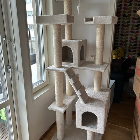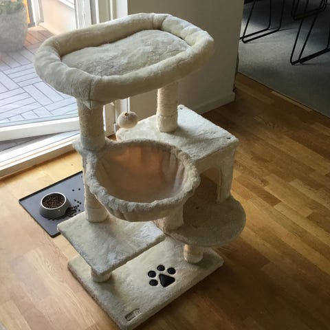 Katträd klöspelare i beige färg med pelare lindad i sisal. Stabil fyrkantig bottenplatta ger stöd när katten klöser och klättrar. Passar för inomhusbruk som klös- och aktiveringsmöbel för katt.