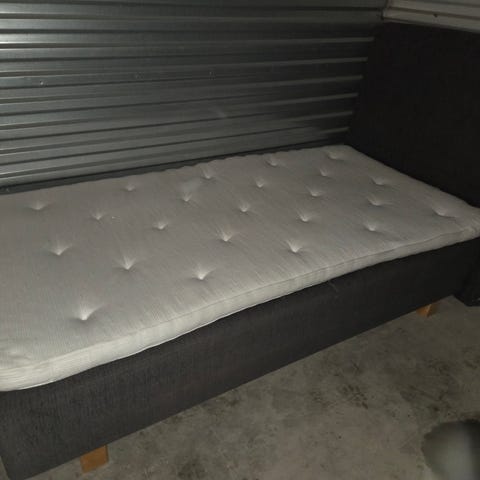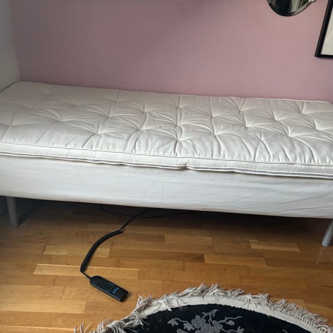 Säng 105cm x 200cm Singås ikea med tillhörande ben och bäddmadrass.