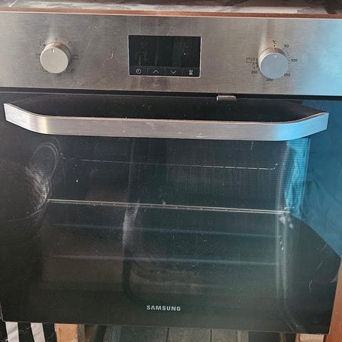 Samsung inbyggnadsugn med varmluftsfunktion. Ugn i rostfritt stål med front i glas och digital display med vredreglage. Elektrisk ugn avsedd för inbyggnad i köksskåp. Passar för vanlig matlagning och bakning med varmluft. Levereras enligt bilderna, med kartong på pall samt installerad ugn som referens till modelltyp. Nypris 6000 kr.