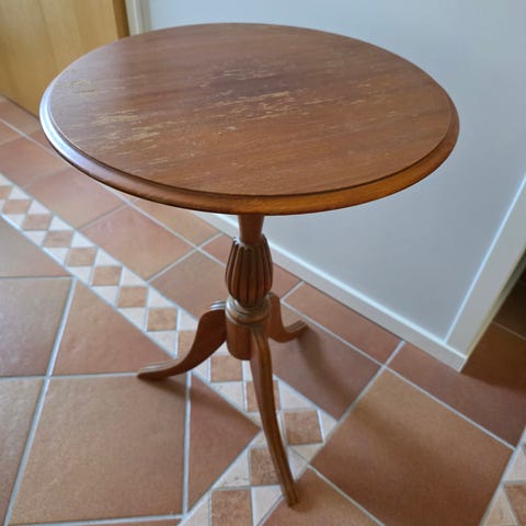Osäker på träslag. Bordet är lätt och kan eventuellt behöva oljas. Några mindre skrapmärken finns, se sista bilden.