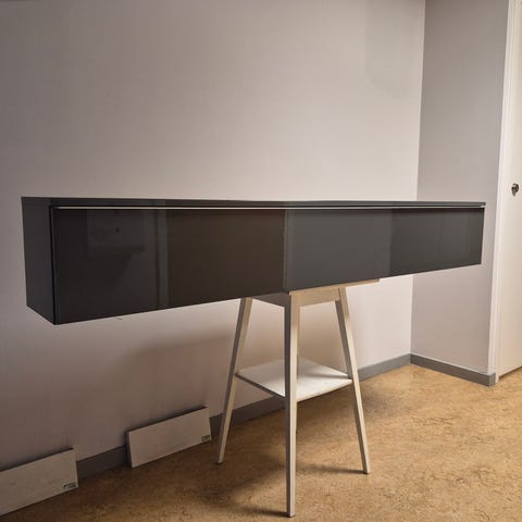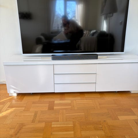 En Bestå tv-bänk från IKEA i fint skick, finns ett hål borrat inne i ett av skåpen för att kunna dra sladdar, annars inget att anmärka på. Se bild för mått.