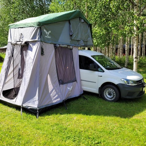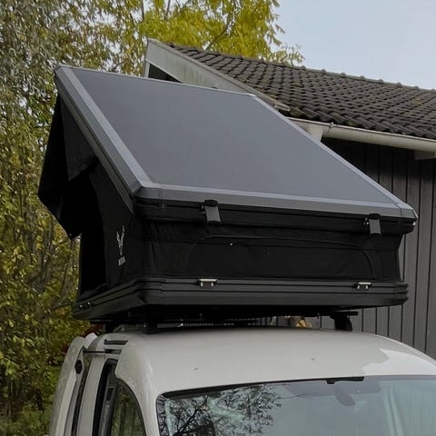 Utfälld (B x L x H): Ca 320 x 184 x 130 cm (inklusive utstickande delar och taklucka)