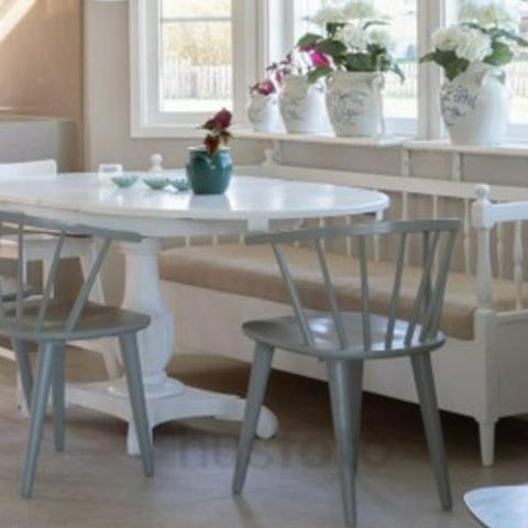 Vitpigmenterat matbord med 4 vitlackade stolar.