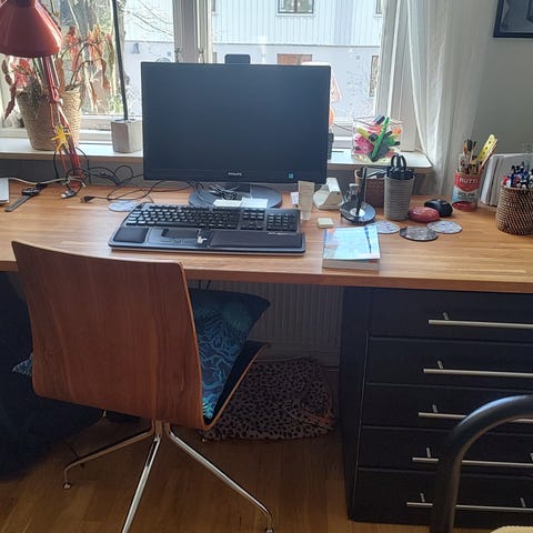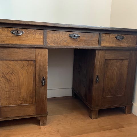 Jättefint ek skrivbord, fint ornerat, med flera lådor framtill. Bordet står på fyra raka ben och har en större mittlåda samt mindre lådor på sidorna, vilket ger god förvaring för exempelvis kontorsmaterial, papper och andra småsaker. Passar som arbetsbord eller skrivbord i hemmakontor eller vardagsrum. Varsamt använt